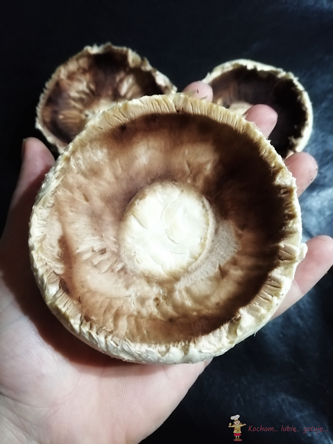 Blaszki, nóżki pieczarek oraz cebulę pokroić w drobną kosteczkę. Na patelni rozgrzać masło klarowane lub olej i podsmażyć cebulę na złoto. Do przesmażonej cebuli dodać pokrojone nóżki i blaszki pieczarek, przesmażyć i odparować.