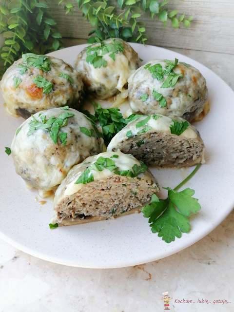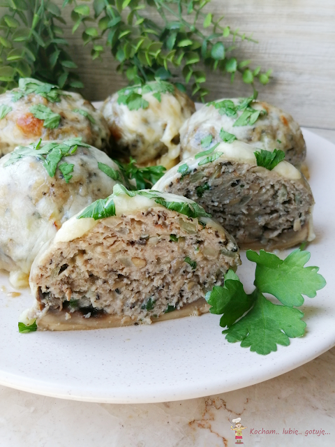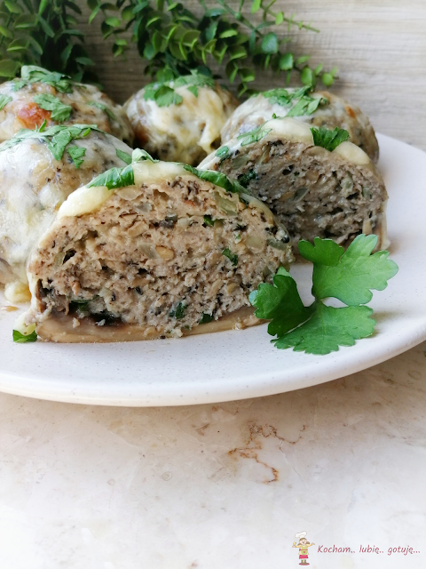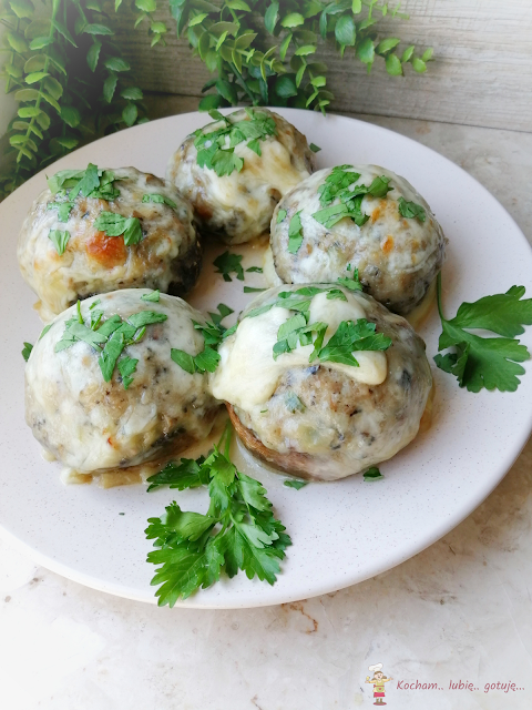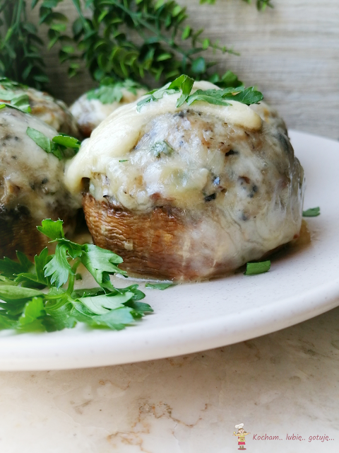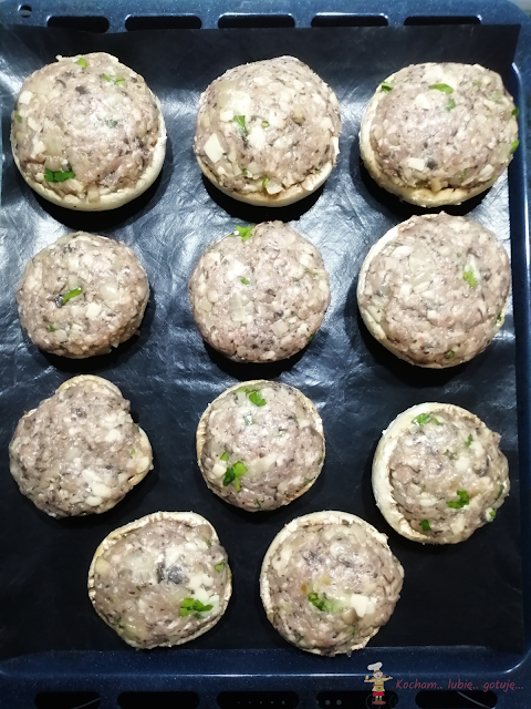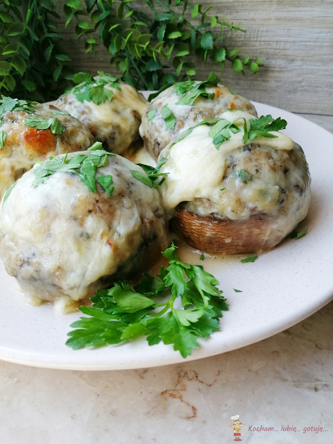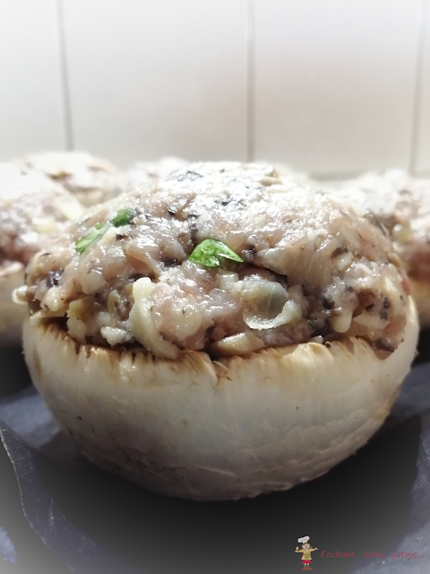 Przygotowanym mięsem nadziewać kapelusze pieczarek, ułożyć na blasze piekarnikowej wyłożonej matą teflonową lub papierem do pieczenia i wstawić do piekarnika nagrzanego do 1800C. Piec 30-35 min w zależności od wielkości pieczarek i ilości farszu. Pod koniec pieczenia (około 5-7 min) pieczarki posypać resztą sera żółtego i dalej zapiekać aż ser się rozpuści. Upieczone pieczarki posypać posiekaną natką pietruszki.