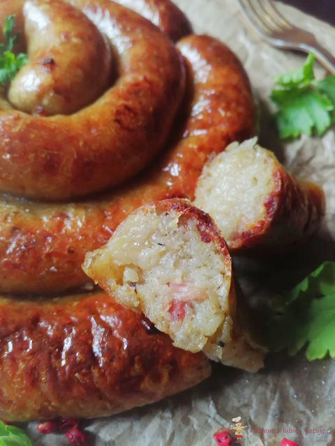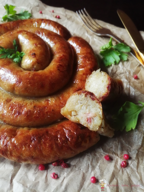Jelita zalać letnią wodą i wymoczyć minimum 30 minut, najlepiej kilka godzin. Następnie przepłukać pod bieżącą wodą. Cebulę i boczek wędzony pokroić w kostkę. Na patelni rozgrzać odrobinkę smalcu (gdy mamy tłusty boczek lub słoninę, smalec pominąć) i przesmażyć boczek wraz z cebulką. Ziemniaki zetrzeć na tarce lub w malakserze na najmniejszych oczkach. Do startych ziemniaków dodać podsmażony boczek z cebulką, mąkę, sól (1/2-1 łyżeczki), dużą szczyptę pieprzu mielonego i majeranku. Całość wymieszać i nadziać luźno w jelita, do około 2/3 jego objętości, końce zawiązać. Można nadziać jedno długie lub okręcać jak kiełbaski.