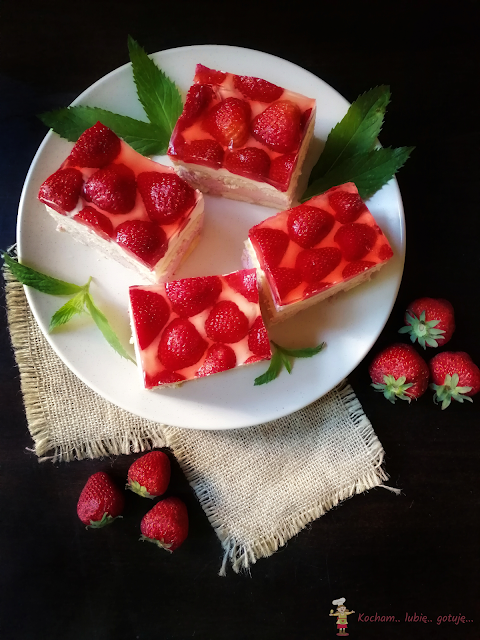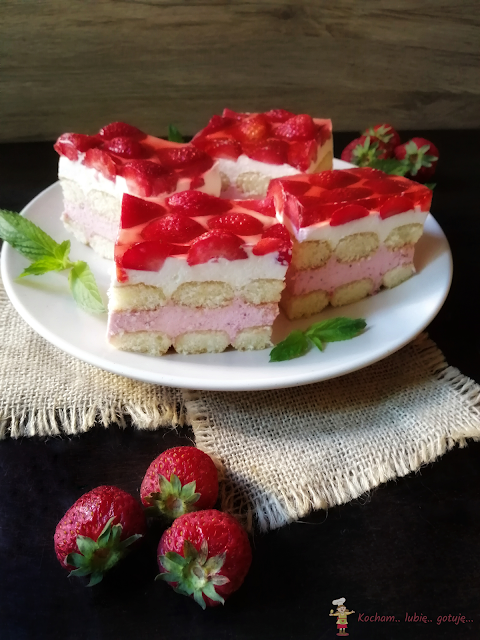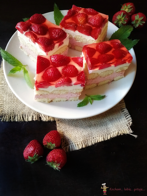 Blachę wyłożyć papierem do pieczenia, na dno ułożyć pierwszą warstwę biszkoptów, wyłożyć masę truskawkową, rozłożyć drugą warstwę biszkoptów i wyłożyć na wierzch pozostałą masę śmietankową. Na wierzchu rozłożyć umyte i pozbawione szypułek truskawki. Blachę wstawić na chwilę do lodówki aby masa stężała. Galaretkę rozpuścić w mniejszej ilości wody niż na pakowaniu (dałam 300 ml), ostudzić i wstawić do lodówki do lekkiego stężenia. Ciasto zalać tężejącą galaretką, wstawić na kilka godzin do lodówki aby biszkopty zmiękły, najlepiej na całą noc.