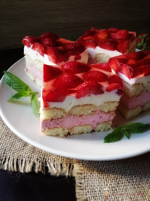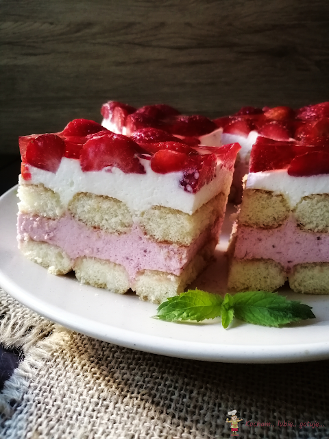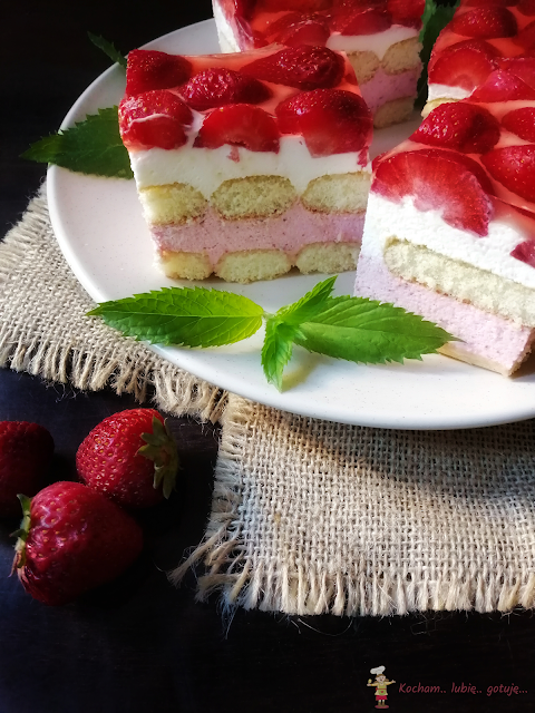 Masa truskawkowa: żelatynę zalać 50 ml wody i zostawić do napęcznienia. Umyte i pozbawione szypułek truskawki zblendować na mus, dosłodzić do smaku cukrem. Żelatynę rozpuścić w mikrofali lub kąpieli wodnej, wymieszać ze zblendowanymi truskawkami i całość dodać do drugiej połowy masy śmietanowej, zmiksować do połączenia.