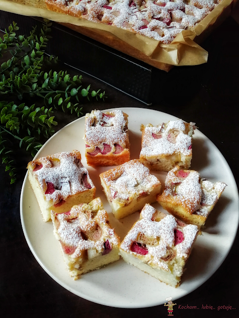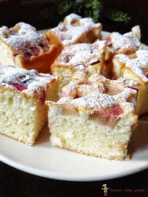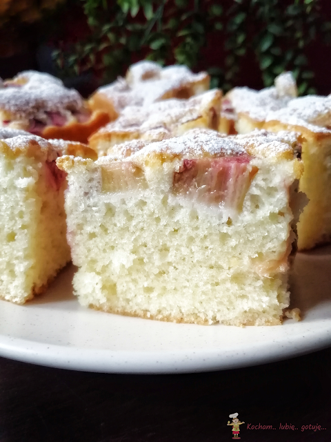 Pyszne, puszyste wilgotne i lekkie ciasto z owocami poleca się na weekend. Przepis pochodzi ze strony Moje Wypieki i autorka piekła je z truskawkami. Moja wersja jest z rabarbarem pokrojonym na cienkie plasterki, ale nadadzą się każde lekkie owoce, które nie obciążą masy, utrzymają się na wierzchu i nie opadną na dno. Sukcesem jest dobrze ubita masa jajeczna oraz delikatne wmieszanie mąki – efekt murowany a ciasto pięknie wyrośnięte, z owocami na górze. Polecam serdecznie :)