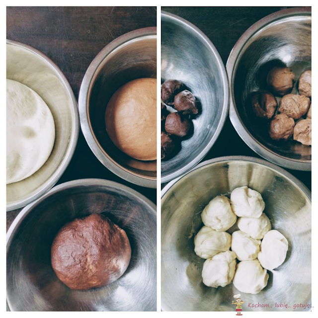 Drugą połowę ciasta ponownie podzielić na dwie części. Do jednej części dodać 3 łyżki kakao, 2 łyżki mleka i wyrobić gładkie ciasto. Do drugiej części dodać 1/2 łyżki kakao i 1 łyżkę mleka, również wyrobić gładkie i elastyczne ciasto. Ciasta z kakao umieścić w miskach, przykryć ściereczką i pozostawić do podwojenia objętości, tak jak ciasto jasne.