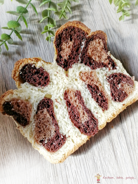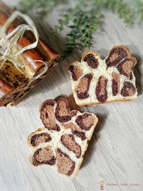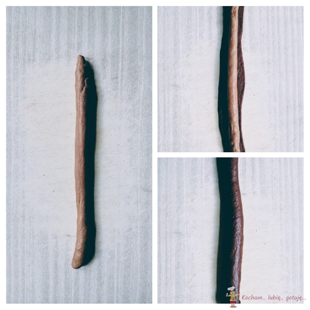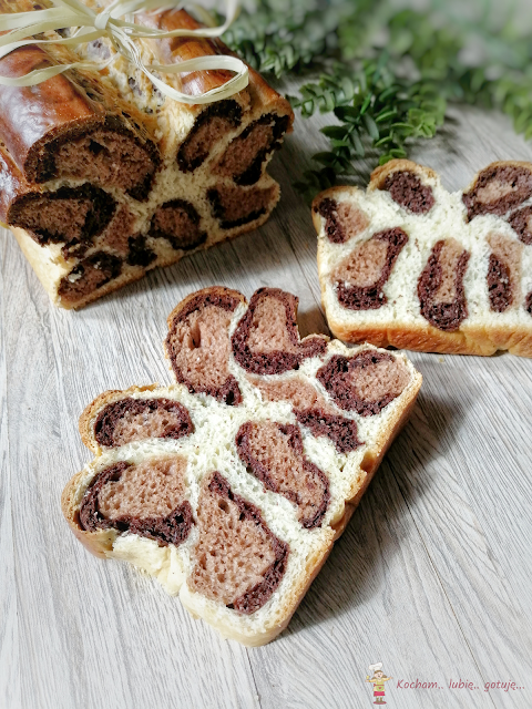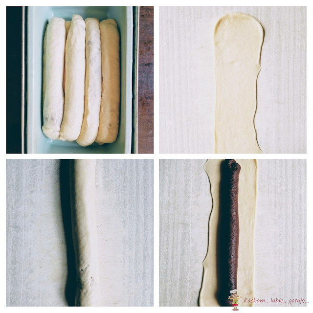 Formę keksówkę wyłożyć papierem do pieczenia lub posmarować masłem – ja używam silikonowej, więc tylko posmarowałam olejem. Po wyrośnięciu ciast każdą kulę odgazować – krótko zagnieść i podzielić każdą na 8 części. Kulkę jaśniejszego kakaowego ciasta uformować w wałeczek długości keksówki. Kulkę ciasta ciemniejszego rozwałkować na długość keksówki, położyć na nim wałeczek jaśniejszego ciasta i zawinąć. Następnie rozwałkować ciasto jasne i zawinąć w nie wcześniej uformowany wałek z ciast kakaowych. Przygotować w ten sposób wszystkie 8 wałeczków. Wałeczki ciasta ułożyć w keksówce, nakryć ściereczką i pozostawić do napuszenia na 40 min.