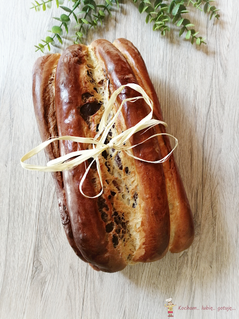 Wierzch chałki posmarować roztrzepanym białkiem. Keksówkę wstawić do piekarnika nagrzanego do temperatury 1800C i piec około 45-50 min, do tzw. suchego patyczka. Po upieczeniu chałkę wystudzić na kratce.