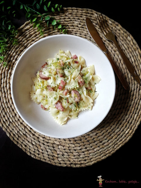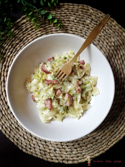 Szeroki rondel z grubym dnem postawić na palniku i dobrze rozgrzać. Przełożyć do rondla boczek i podsmażyć. Gdy wytopi się już troszkę tłuszczu a boczek lekko podsmaży dodać pokrojoną kiełbasę i cebulę, całość przesmażyć aż cebula się zezłoci. Następnie do rondla dodać poszatkowaną kapustę i razem przesmażyć, dodać listek laurowy i podlać wodą/bulionem. Przykryć pokrywą i poddusić na wolnym ogniu aż kapusta będzie miękka – około 15 min. Następnie doprawić kapustę solą i pieprzem, w razie potrzeby odparować nadmiar płynów. Na końcu dodać posiekany koperek i ugotowany makaron, wymieszać i chwilkę razem podgrzać.