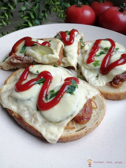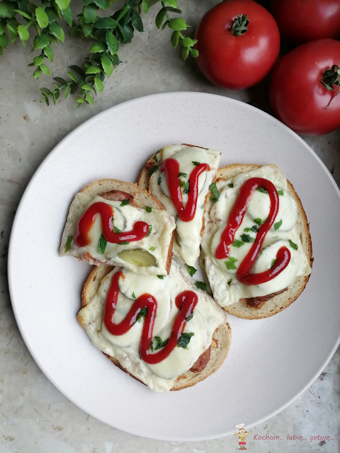 Kromki chleba posmarować masłem, rozłożyć podsmażoną cebulkę, na to plasterki kiełbasy i ogórka, całość przykryć plastrem sera żółtego. Kromki chleba ułożyć na blasze z wyposażenia piekarnika wyłożonej papierem do pieczenia lub matą teflonową i wstawić do piekarnika nagrzanego do temperatury 2000C, zapiekać 8-10 minut aż ser na wierzchu się rozpuści.