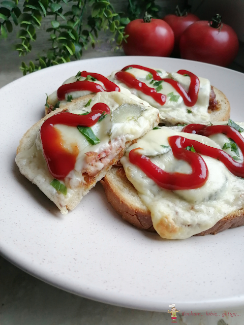 Sposób na czerstwy chleb? Grzanki z ulubionymi dodatkami – u nas z domową kiełbaską na ostro, z chili, ogórkiem kiszonym, podsmażoną cebulką i serem żółtym. Tak prosto a tak pysznie! Polecam serdecznie :)