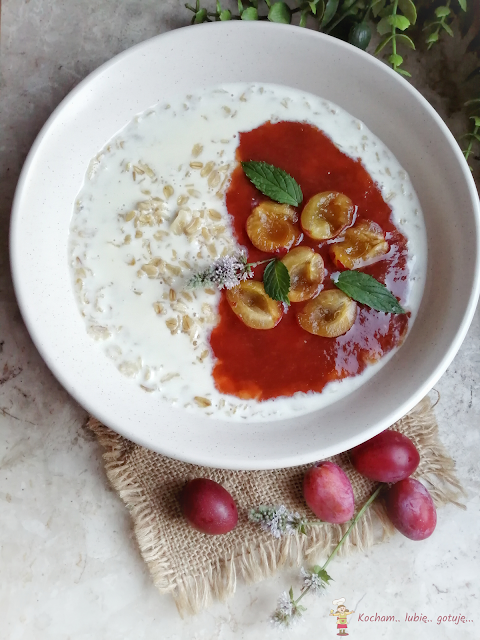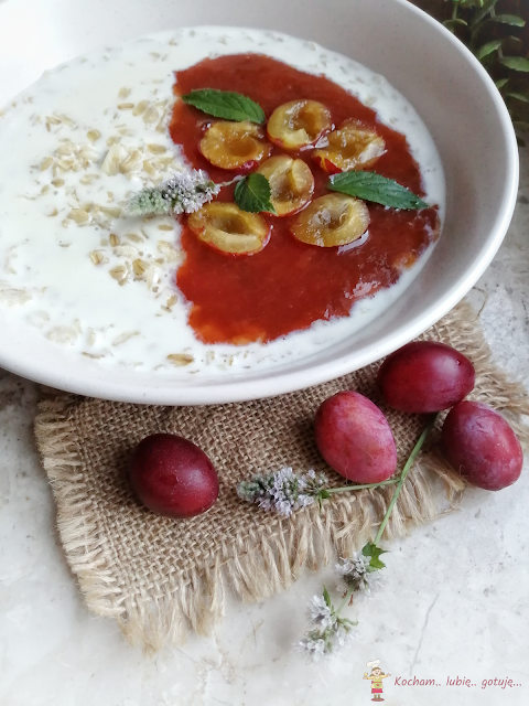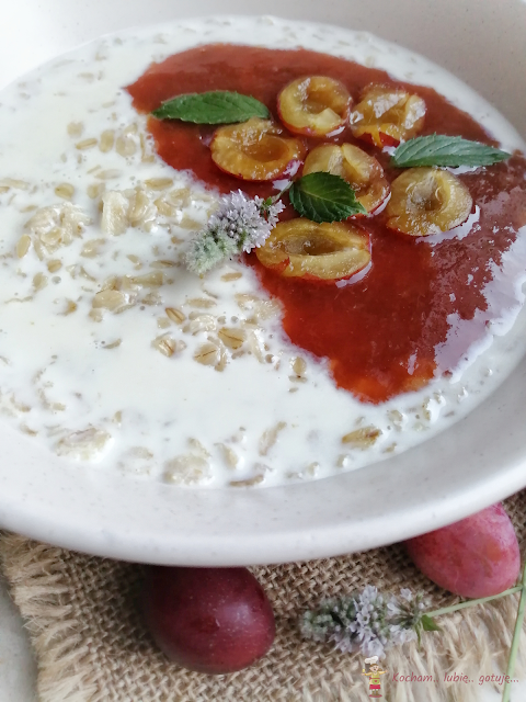 Uwielbiam owsianki na mleku z dodatkiem świeżych owoców, musów owocowych, karmelizowanych owoców i innych owocowych przetworów. Akurat po sezonie wiśniowym jestem w trakcie przerabiania śliweczek i robiąc mus nabrałam ochoty na owsiankę z tymże musem. Aromatyczny mus śliwkowy z dodatkiem cynamonu i goździków, istna jesienna kompozycja … ale smakuje wyśmienicie o każdej porze :) Moja owsianka jest z tych rzadszych, bo taką lubię ale jeśli lubicie gęste owsianki dodajcie jedną łyżkę płatków więcej. Polecam serdecznie :)