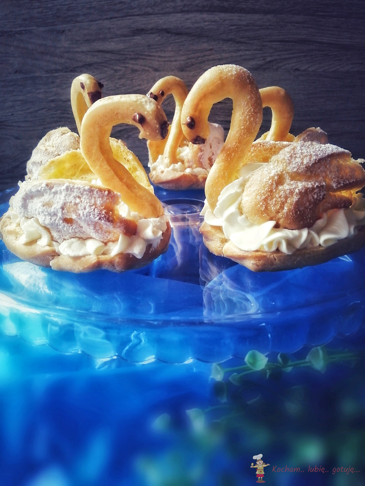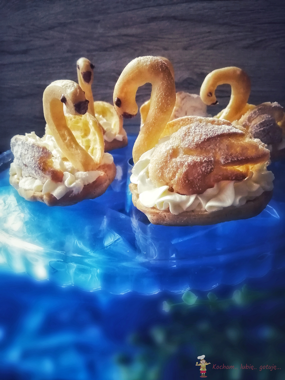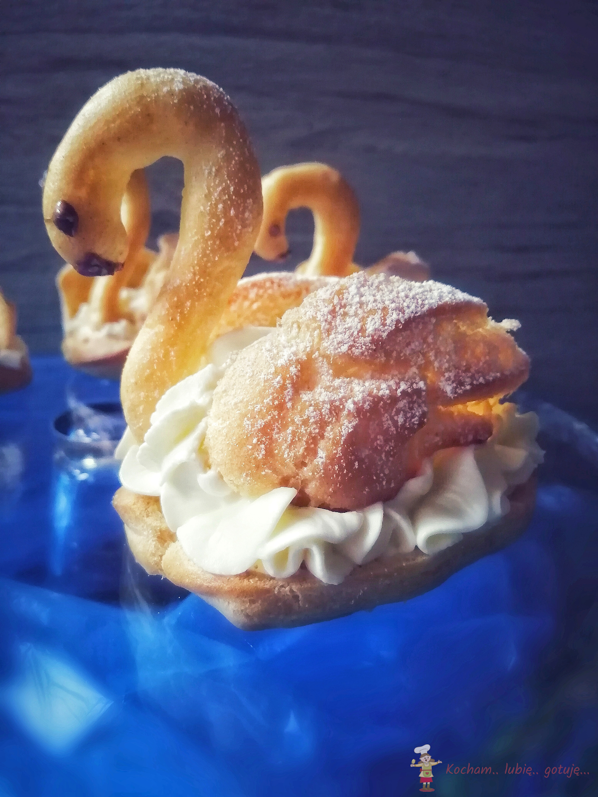 Ptysie w kształcie łzy przeciąć wszerz na dwie części, następnie górną część przeciąć wzdłuż na dwie połowy – to będą skrzydła. Na spód ptysia za pomocą rękawa cukierniczego i ozdobnej tylki wycisnąć krem. Włożyć szyję z namalowanymi za pomocą wykałaczki oczami i dziobem z roztopionej czekolady, po bokach wcisnąć w krem skrzydła rozcięciem na dół i łabędzia oprószyć cukrem pudrem.