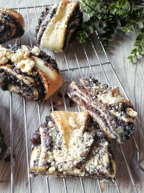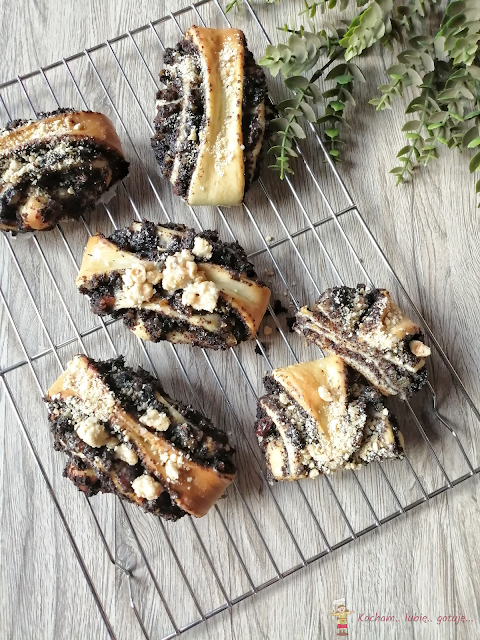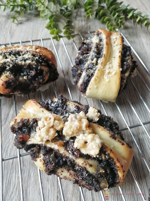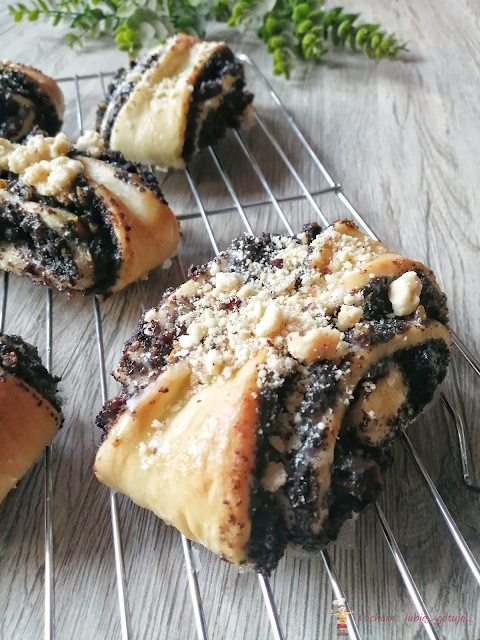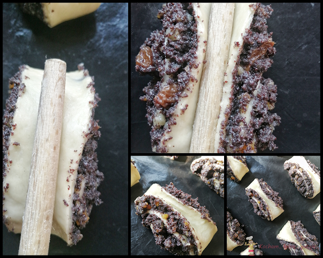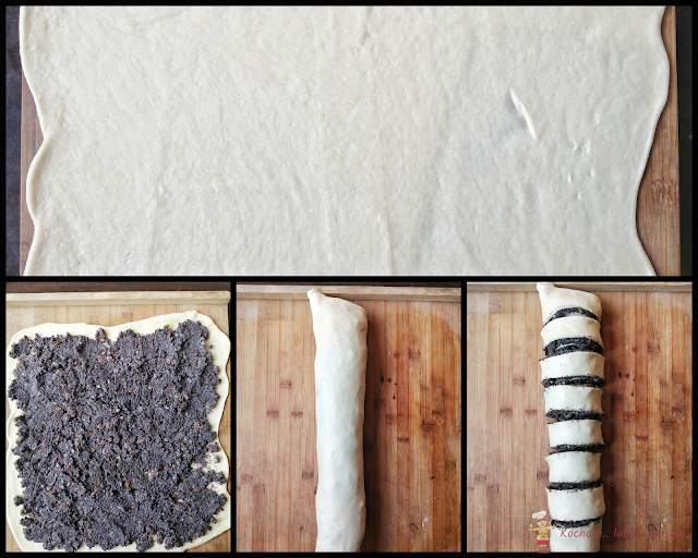 Po tym czasie ciasto podzielić na 2 części. Każdą część ciasta rozwałkować na duży prostokąt – u mnie 40 cm x 30 cm. Na rozwałkowanym cieście rozsmarować masę makową i zwinąć ciasto wzdłuż dłuższego boku w roladę. Ostrym nożem pociąć roladę na kawałki (u mnie 9 szt, o szerokości 4,5 cm). Bułeczki ułożyć na blasze wyścielonej papierem do pieczenia lub matą teflonową w odstępach, nakryć lnianą ściereczką, zostawić do napuszenia na około 25-30 min. Przed pieczeniem końcem drewnianej łyżki nacisnąć wzdłuż na środku każdej bułeczki aż brzegi się uniosą.