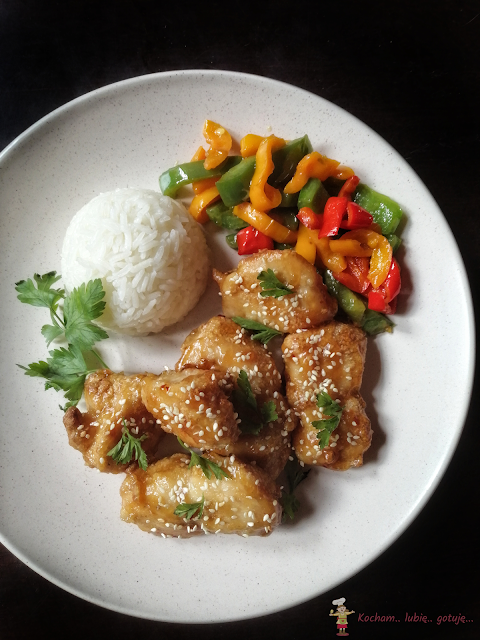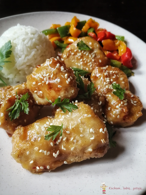 Upieczone kawałki kurczaka przełożyć do ciepłego sosu i delikatnie przemieszać aby każdy kawałek kurczaka obtoczony był dobrze w sosie. Kurczaka posypać podprażonym sezamem, udekorować szczypiorkiem lub zieloną kolendrą.