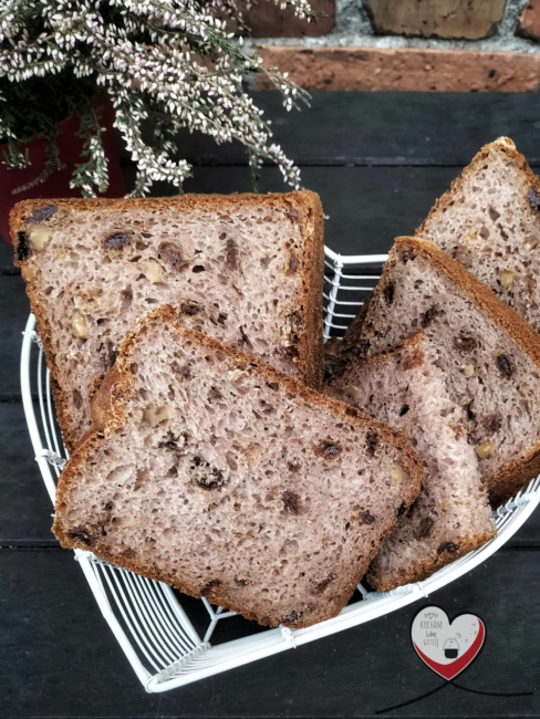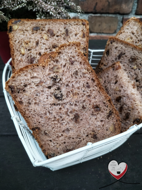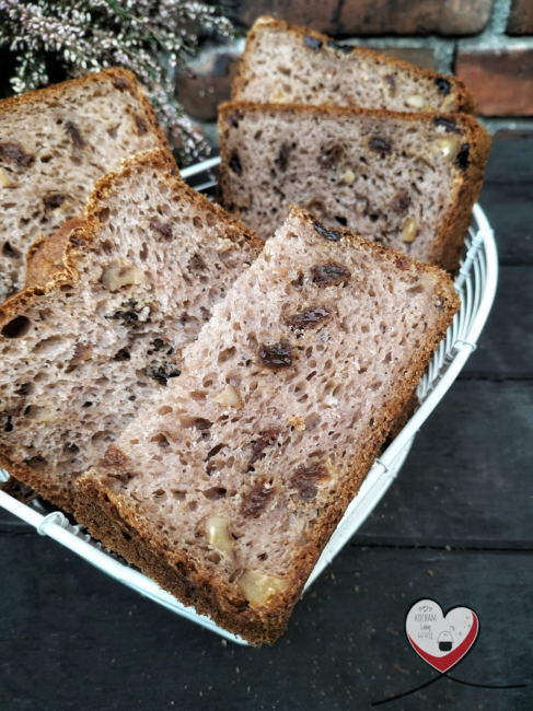 Kolejny przepis na zagospodarowanie dojrzałych bananów – chlebek bananowy na drożdżach, z orzechami i rodzynkami. Cała słodycz pochodzi z bananów i rodzynków, cukru dajemy tylko do rozrobienia drożdży. Efektem jest wypiek pomiędzy ciastem drożdżowym a chlebem pszennym. Serdecznie polecam :)